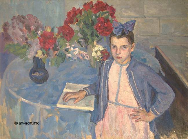Portrait der Tochter Julia mit blauer Schleife1964, Leinen, Öl, 102.6 x 137